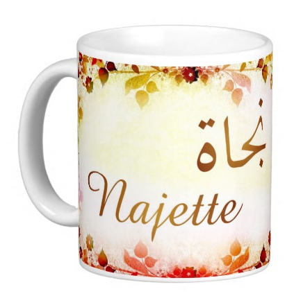 Mug avec le prénom "Najette" écrit en français, en arabe (نجاة) et calligraphié de façon artistique en arabe sur la partie droite.
