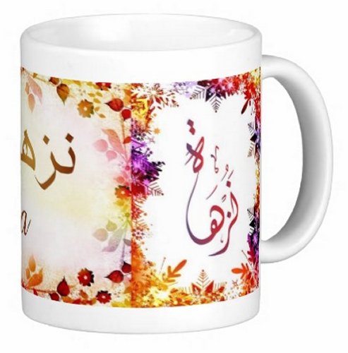 Mug avec le prénom "Nazha" écrit en français, en arabe (نزهة) et calligraphié de façon artistique en arabe sur la partie droite.