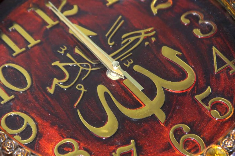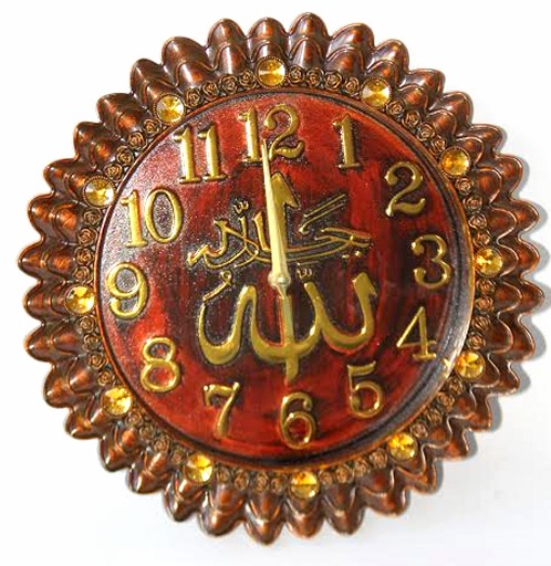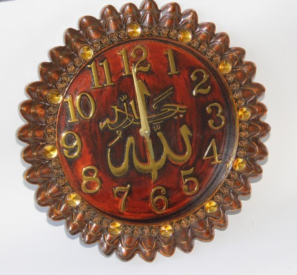 Cette horloge en forme de soleil brille de mille feux grâce à ses parties dorées et ses diamants. L'inscription "Allah" en arabe au centre vous rappellera constamment le Tout-Puissant. L'horloge possède un charme religieux. Son style baroque est marqué par sa forme ronde et sa couleur bois.