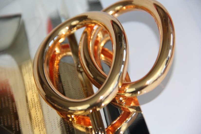 Ensemble de deux plateaux métalliques en inox de forme rectangulaire avec parties dorées... Poignées ovales dorées.