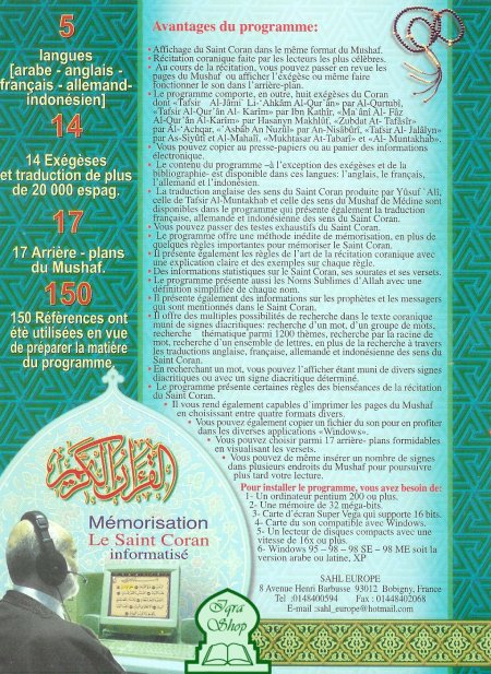 Il contient également 14 exégèses du Coran (Ibn Kathir, Al Qurtubi, Annayssaburi...), offre une méthode de mémorisation inédite, présente les règles de récitation du Coran,...