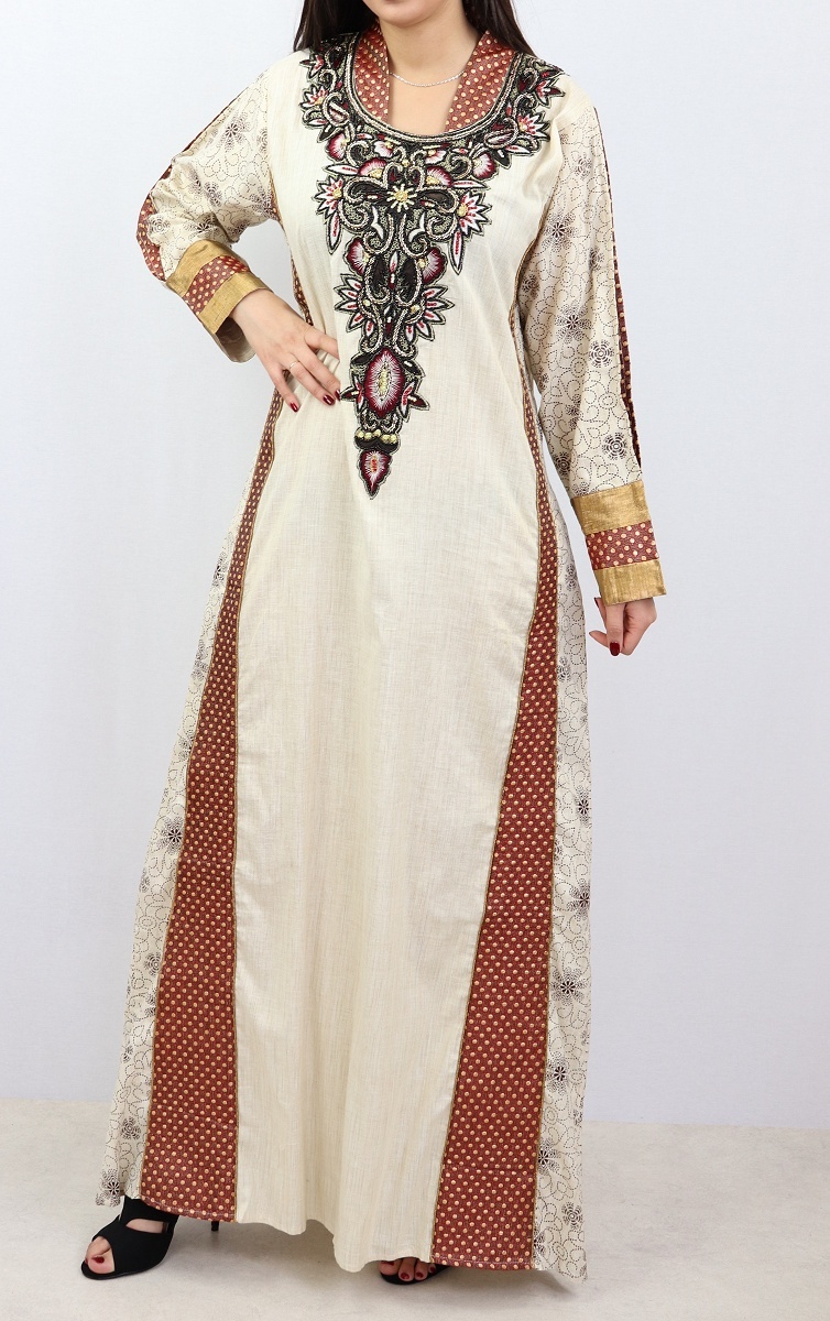 Ce modèle est classe et sa beauté réside dans sa simplicité. Le choix des couleurs est réfléchi et la coupe évasée a été plébiscitée pour plus de pudicité.