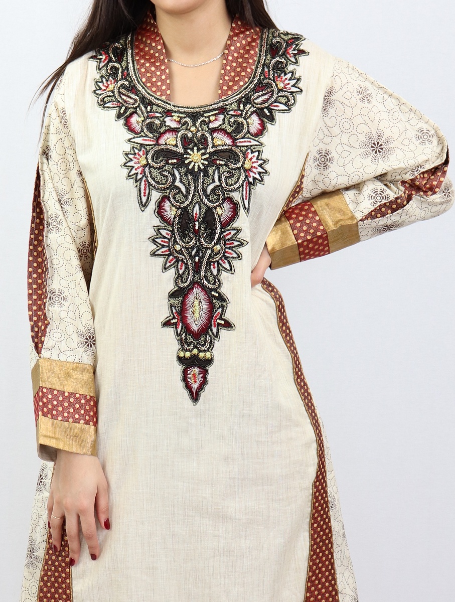 Cette très longue robe de soirée a une belle couleur blanc cassé, c'est une pièce de haute qualité. Les nombreuses broderies sur le devant et sur le dos apportent un fort sentiment d'élégance et de bon goût.