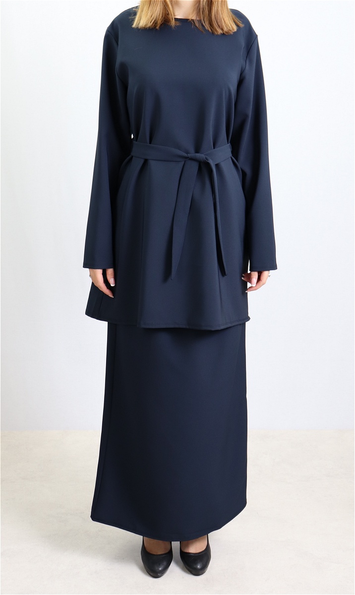La tunique symétrique de l'ensemble ainsi que sa longue jupe opaque toutes deux de couleur bleue nuit produisent un effet stylé et discret à la fois.