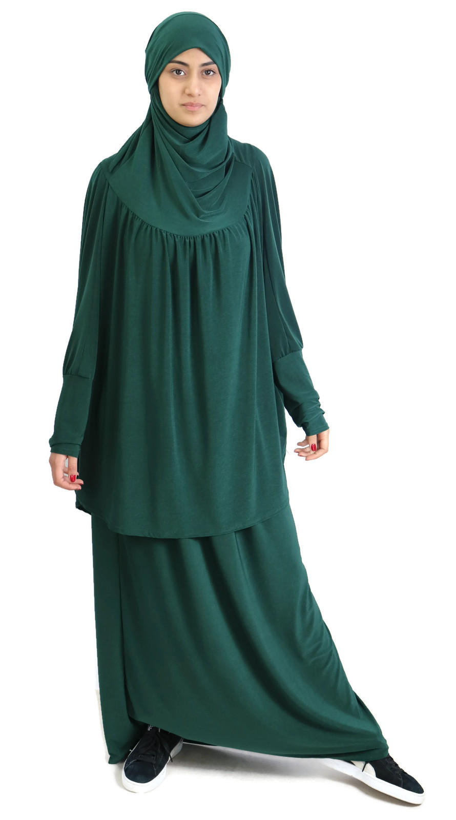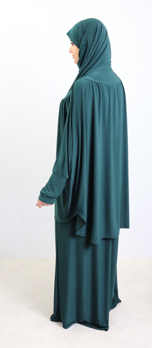 Ce Jilbab deux pièces est composé d’un demi-jilbab (grande cape avec bandeau intégré) avec manches élastiques, et d'une jupe assortie.
