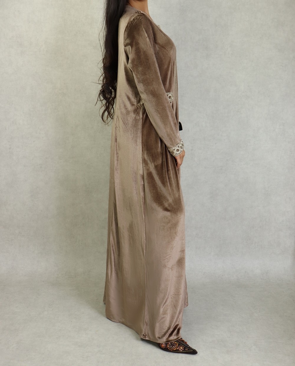 Confectionnée dans un style chic et classique, cette robe longue en velours saura vous satisfaire avec ses broderies fines.