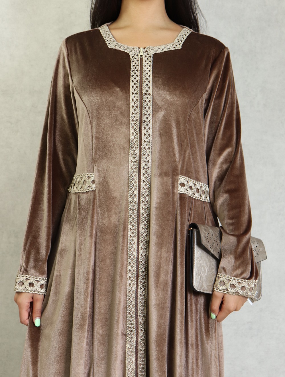 Robe longue, encolure en cœur, fermeture zip sur toute la longueur, broderies sur le devant et sur la taille ainsi que sur les poignets, tissu extensible et fluide, effet velours très doux, coupe évasée.