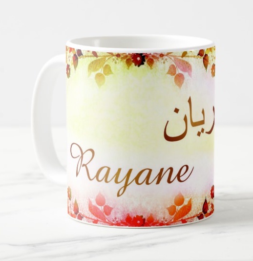 Mug avec le prénom Rayane calligraphié en arabe ainsi que son écriture normale en arabe (ريان) et en français.