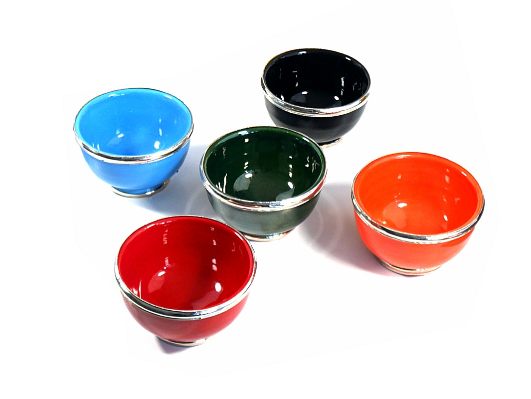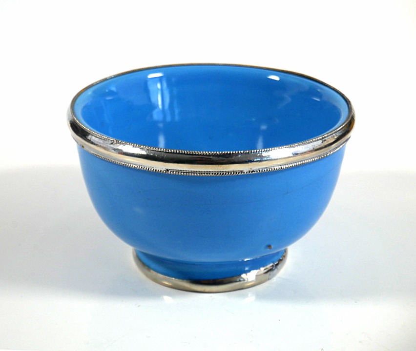 Ce beau récipient bleu clair, de grande taille, en poterie est en provenance de Marrakech (Maroc). Il est émaillé et cerclé de métal argenté légèrement ciselé.