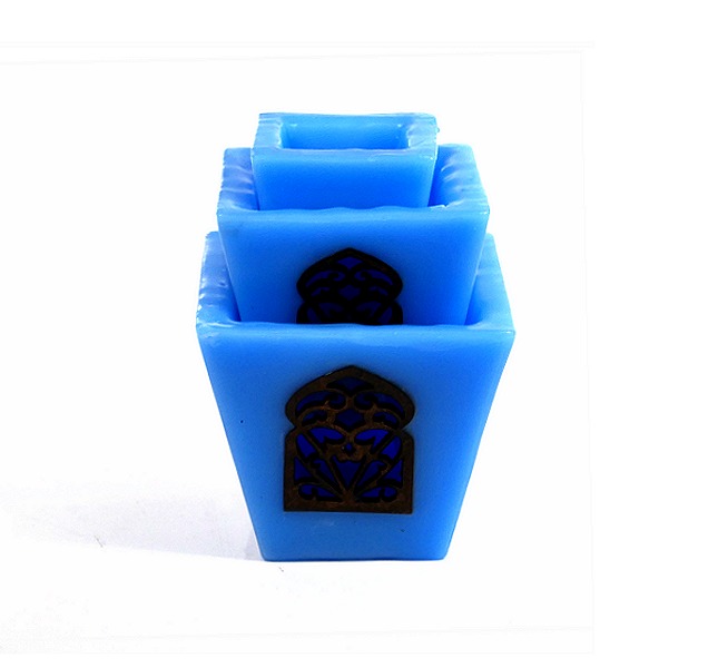 Ensemble de 3 photophores décoratif, provenant de Marrakech (Maroc), peint en bleu clair, émaillé, jolies ciselures en forme de porte,...