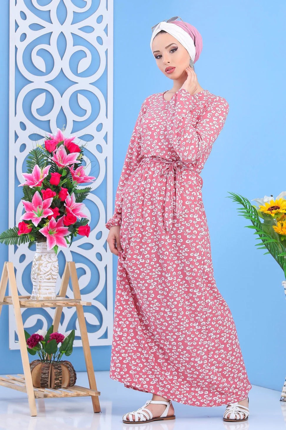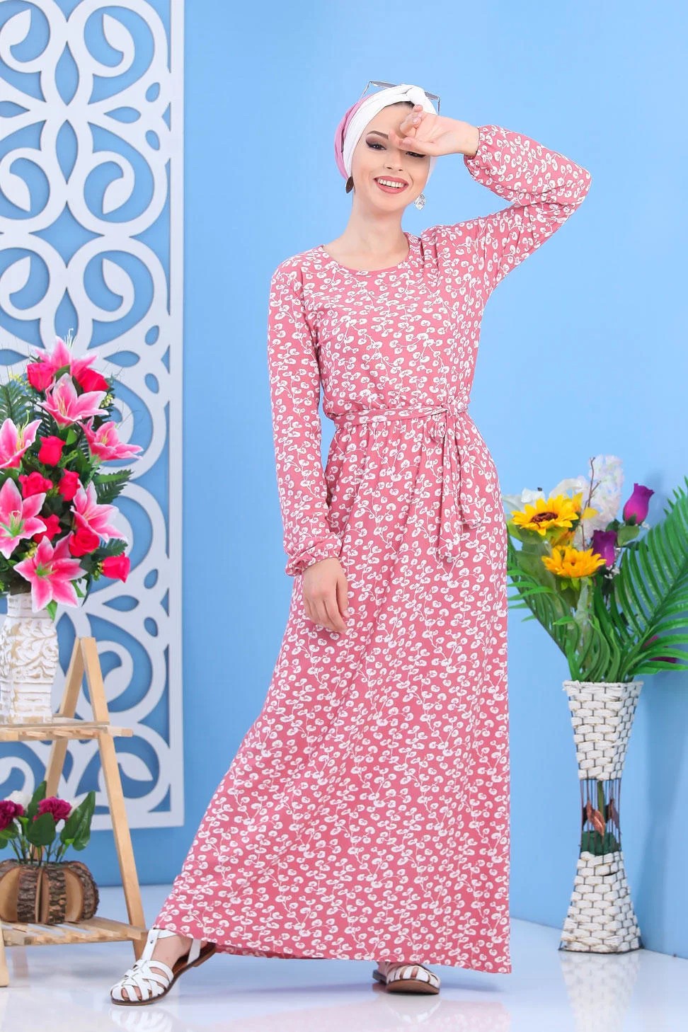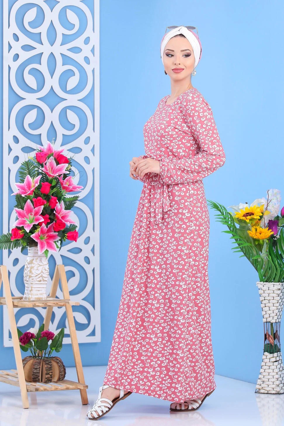 Robe longue (Maxi Dress), imprimés nénuphar de couleur blanc, col rond, élastiques a la taille et aux poignets, accommodée d'une ceinture, coupe évasée.
