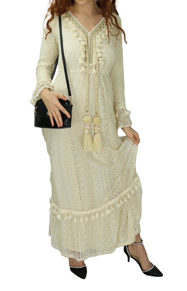Robe chic et élégante en dentelle super tendance avec doublure, col en V, broderies variées. Cette pièce se démarque avec ses pompons et coquillages sur ses cordons décoratifs.