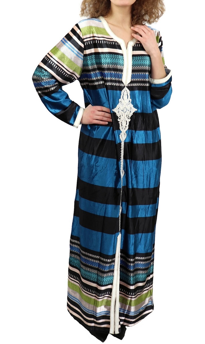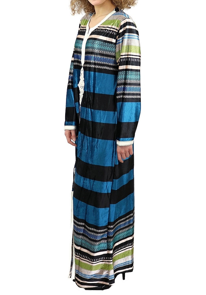 Robe longue d’intérieur, col rond semi-ouvert orné d'une broderie ainsi que les poignets, le devant et les cotés, tissu effet velours. Optez pour ce modèle joli et original avec ses rayures variées. Tissu ne nécessitant aucun repassage.