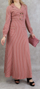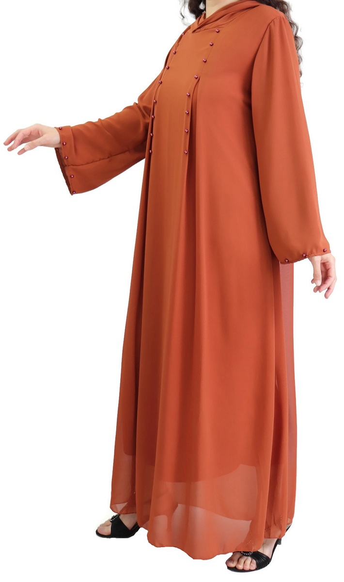 Robe longue, col capuche, entièrement doublée, manches longues, orné des perles sur le devant ainsi que les poignets. Sobre et élégant, Cette tenue s’accommode pour diverses occasions aussi bien festives que quotidiennes.