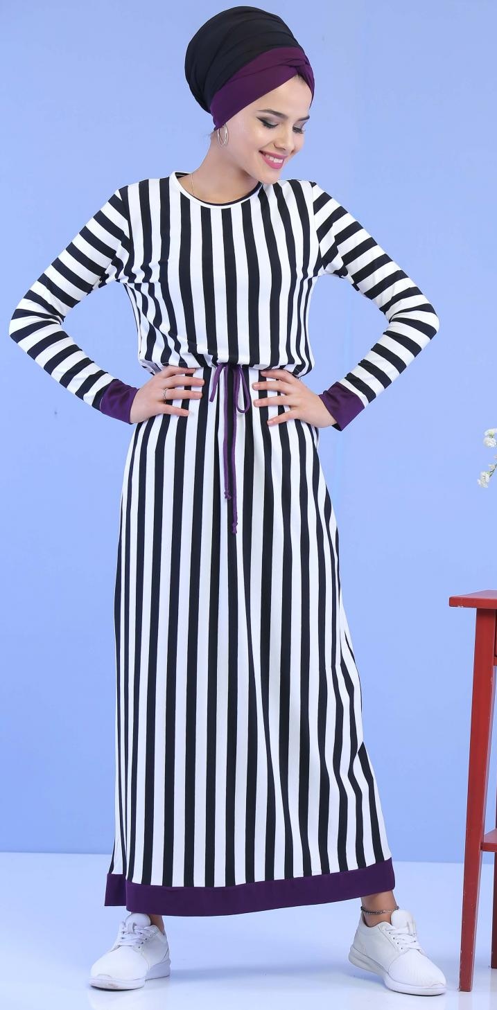 Robe longue, col rond, coupe droite, taille avec lien de serrage. Modèle classique et sobre, approprié pour la mi-saison en toute décontraction.