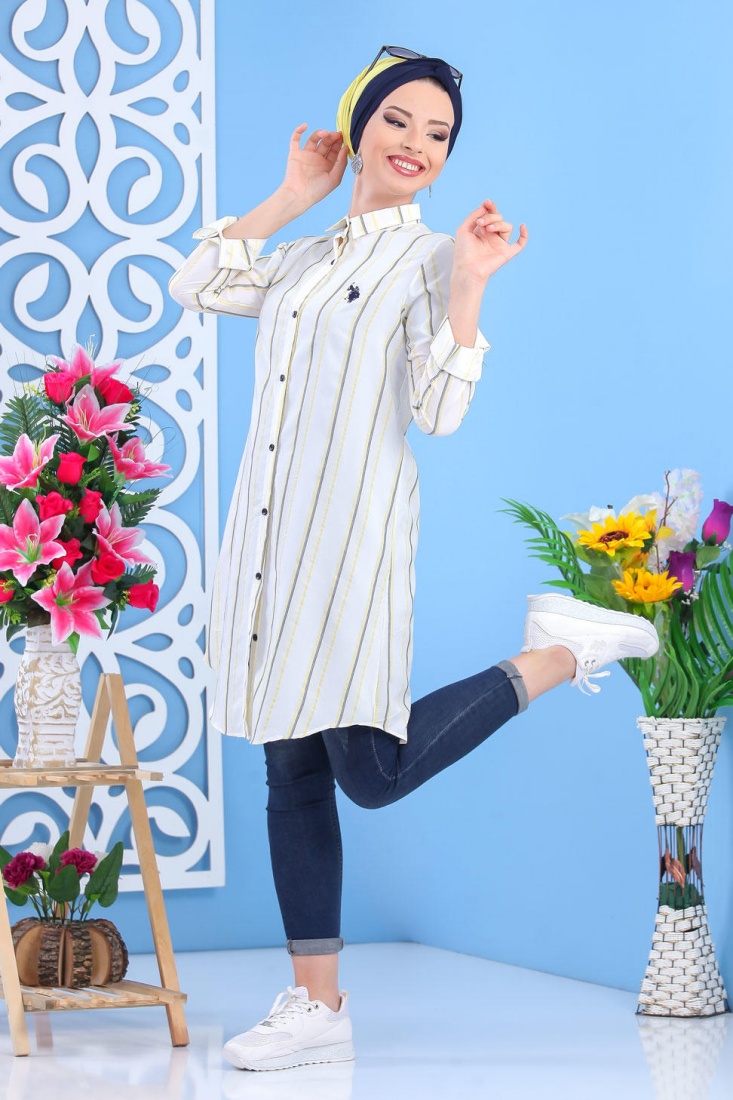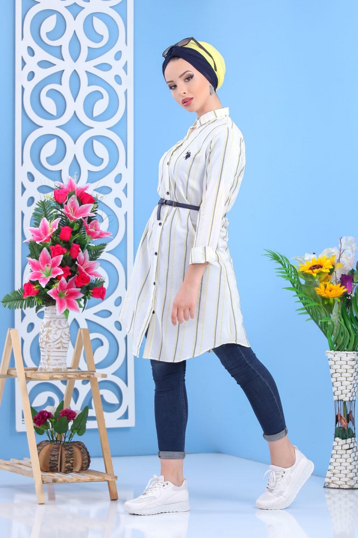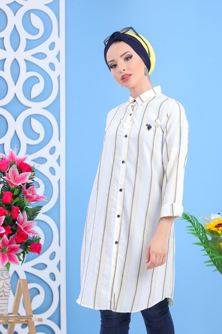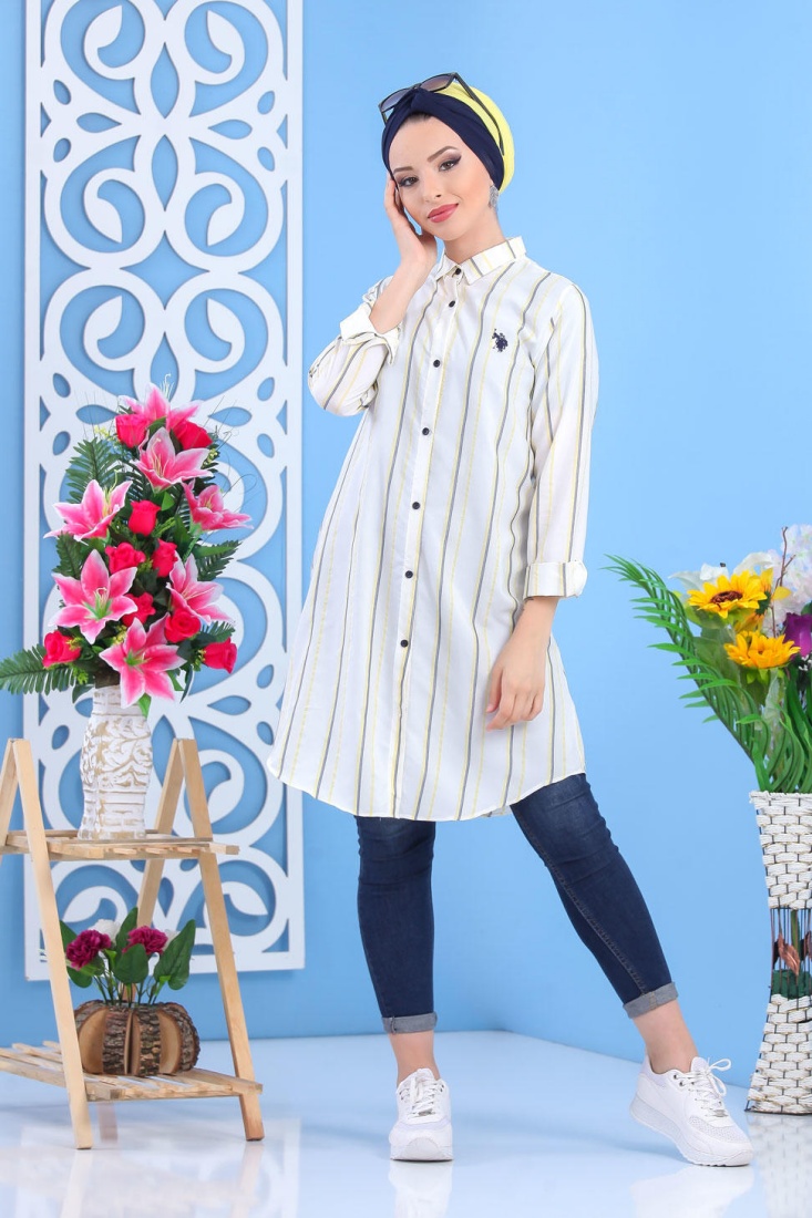 Chemise longue blanche avec rayures couleur.