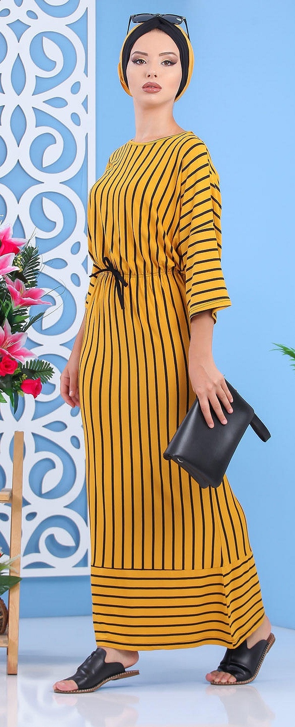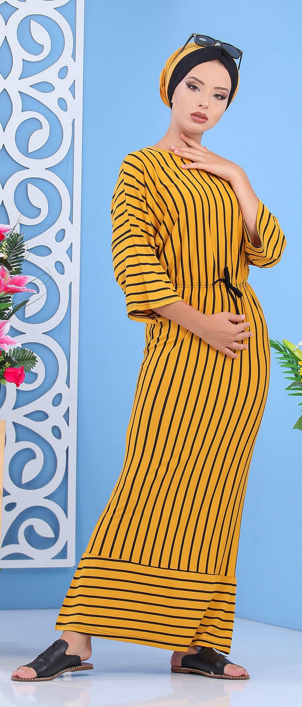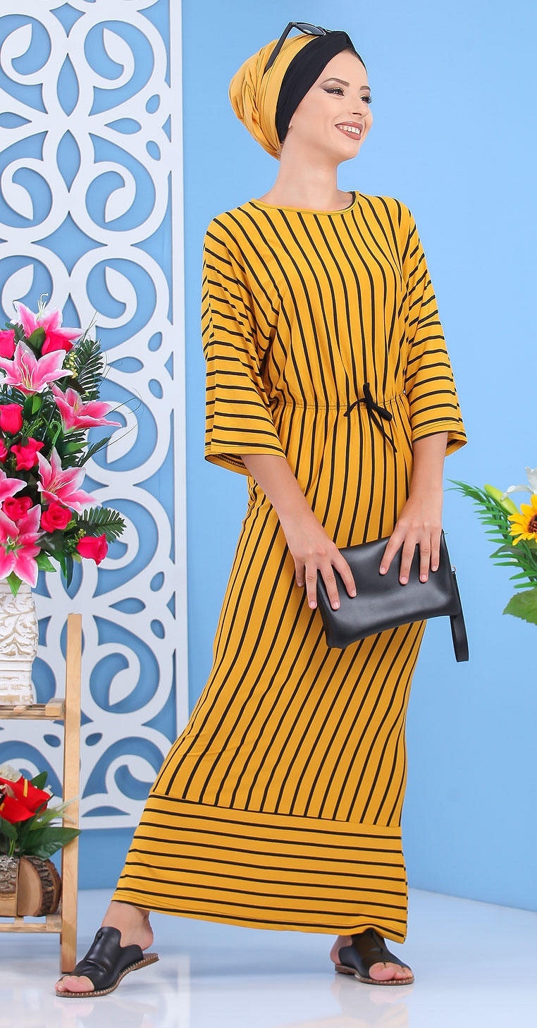 Robe à rayures, col rond, manches effet papillon, taille cintrée par un élastique, le tout orné d'un lien décoratif. Ce modèle sobre et élégant peut se mettre dans multiples occasions.