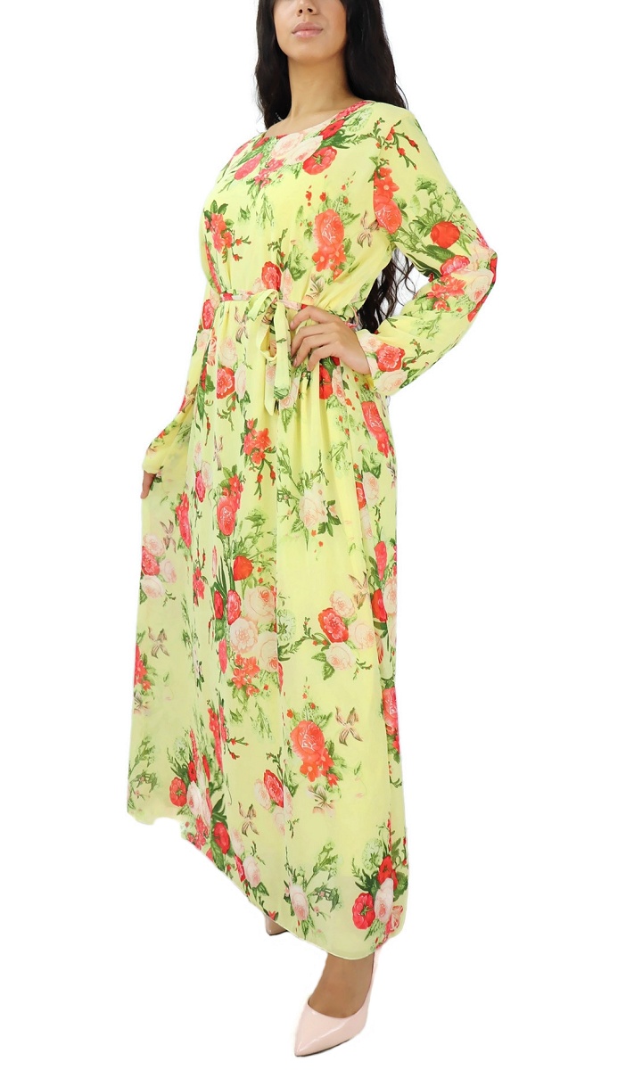 Robe longue, entièrement doublée, encolure ronde, manches longues, accompagnée d'une ceinture à nouer sous passants à la taille. Elégante et féminine, cette robe se porte en toutes occasions.