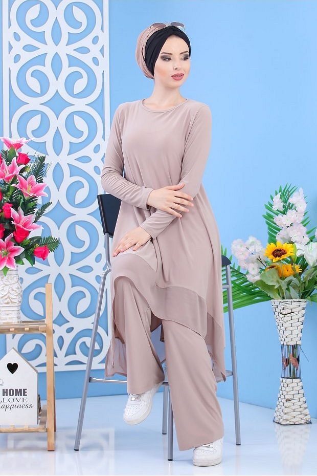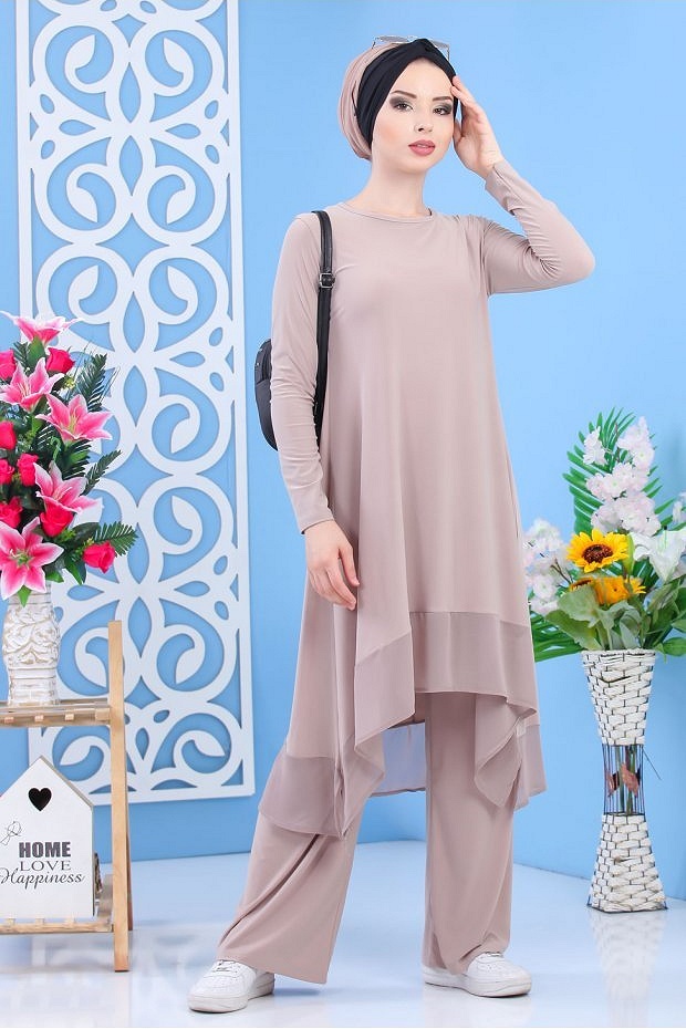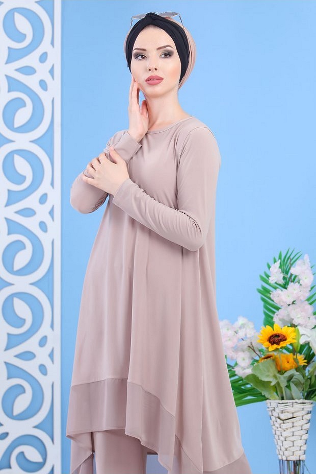 Ensemble 2 pièces, tunique mi longue, col rond, coupe évasée, manches longues. Pantalon coupe ample, taille élastique. Joli ensemble simple et chic avec son tissu léger et agréable. Ce modèle permet d’être porté en toute décontraction et en toute saison.