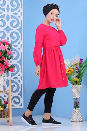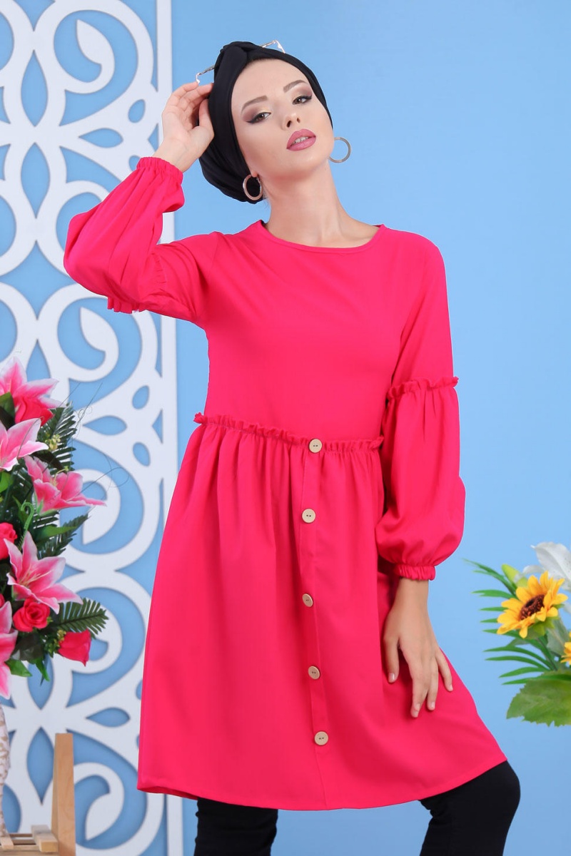 Tunique longue, col rond, manches bouffantes finition élastiques au niveau des poignets, taille cintrée et élastique, tissu effet crêpe. Ce modèle simple et classique vous conviendra car il s'assemble avec tout type de vêtements, les boutons d'ornement ajouteront un plus.