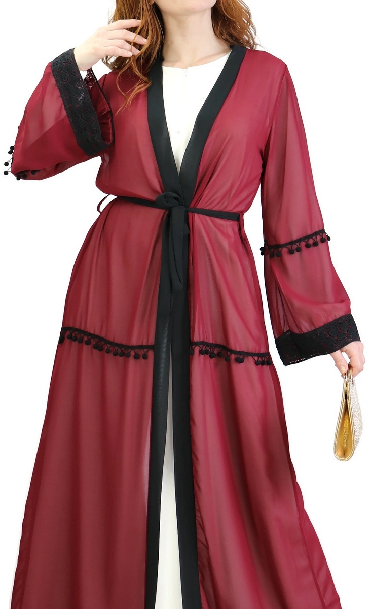 Simple et utile, il se porte ouvert ou fermé et on peut l'ajuster à la taille ou non selon les circonstances. Ses manches sont légèrement évasées, elles sont ornées de pompons qui feront sensation, alors saisissez l'occasion en vous offrant ce beau cardigan.