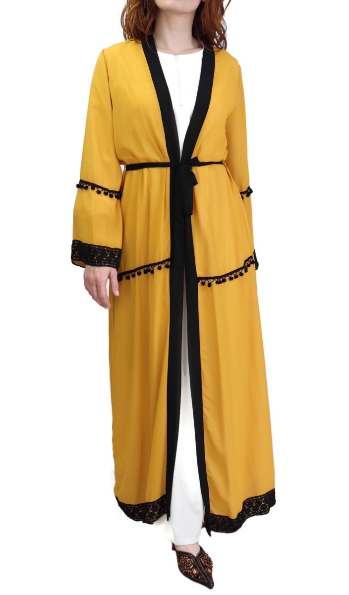 Simple et utile, il se porte ouvert ou fermé et on peut l'ajuster à la taille ou non selon les circonstances. Ses manches sont légèrement évasées, elles sont ornées de pompons qui feront sensation, alors saisissez l'occasion en vous offrant ce beau cardigan.