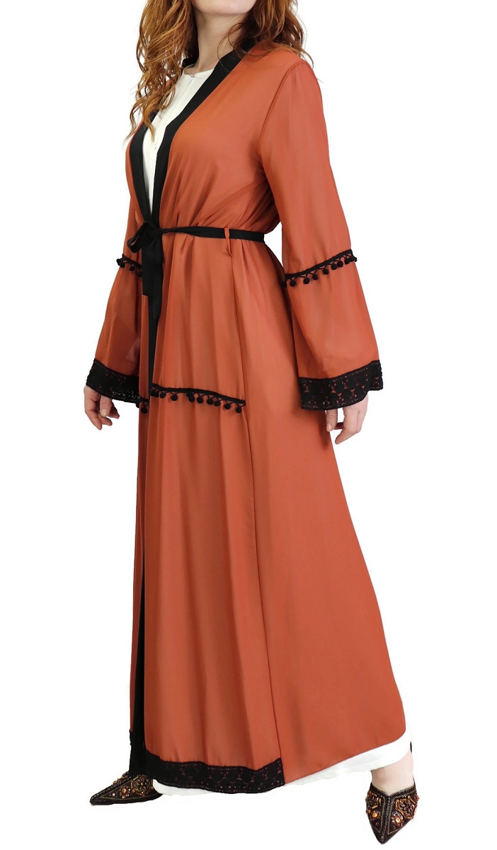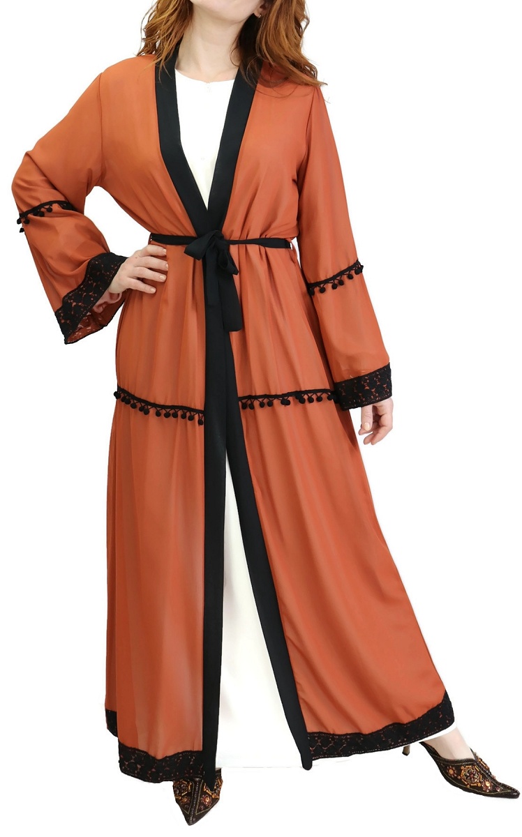 Simple et utile, il se porte ouvert ou fermé et on peut l'ajuster à la taille ou non selon les circonstances. Ses manches sont légèrement évasées, elles sont ornées de pompons qui feront sensation, alors saisissez l'occasion en vous offrant ce beau cardigan.