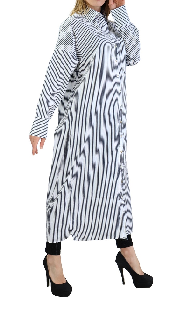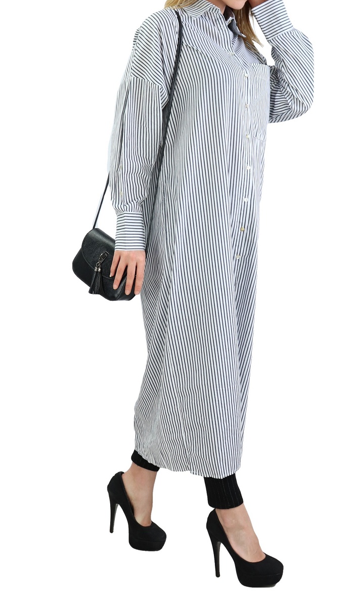 Robe chemise, col chemisier, poche plaquée, fermeture boutons, manches longues. Confectionnée pour les personnes qui veulent allier robe et chemise. Les rayures restent une valeur sure et indémodable.