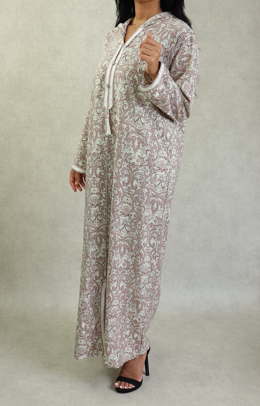 Robe longue, col en V, Manches longues, fluide et légère à fleurs, avec un liseré autour de la capuche, manches et ainsi sur le buste.