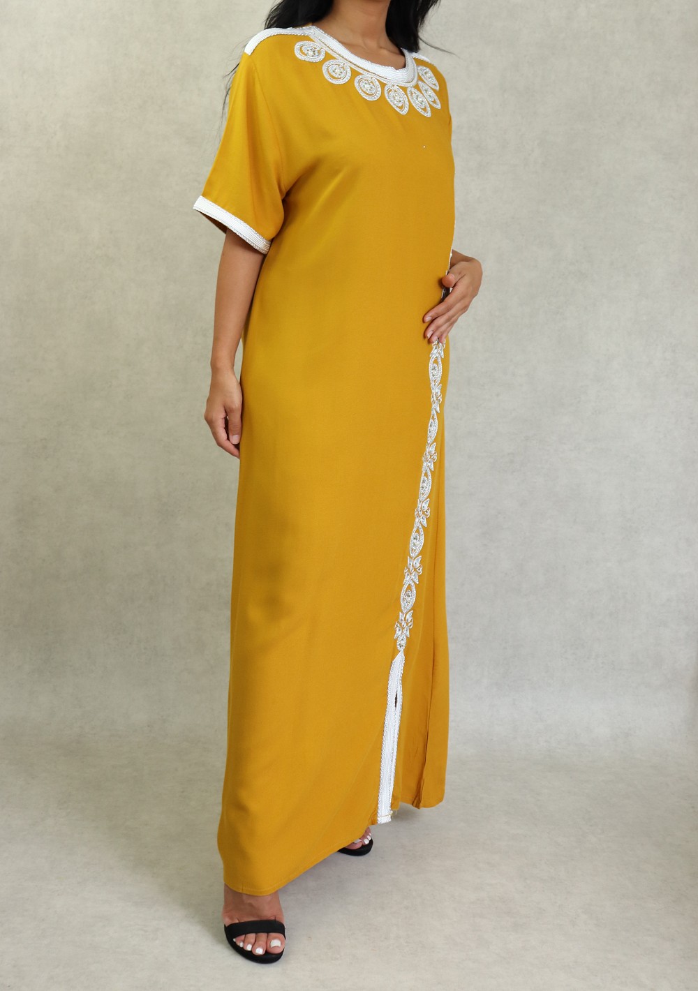 Belle robe style oriental à manches courte avec broderies de qualité sur l'encolure et toute la longueur. Tenue sobre et élégante, parfaite pour occasions et événements.