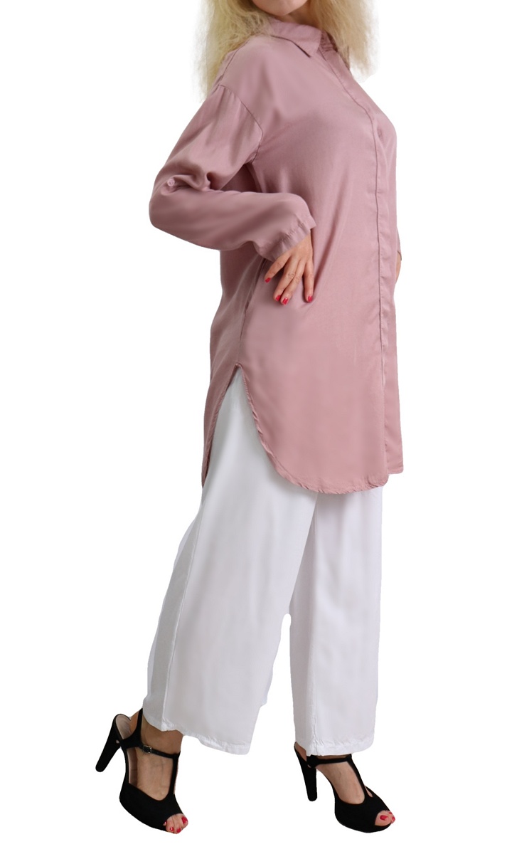 Chemise longue, manches ajustables, fermeture boutonnage caché, deux poches latérales, tissu doux, coupe droite.