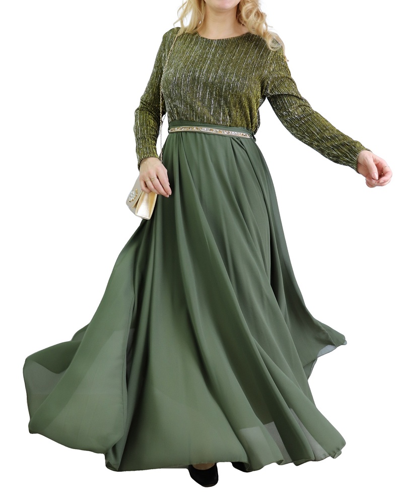 Robe de soirée maxi-longue haut brillant à manches longues - Couleur Vert olive Vetement & Accessoire