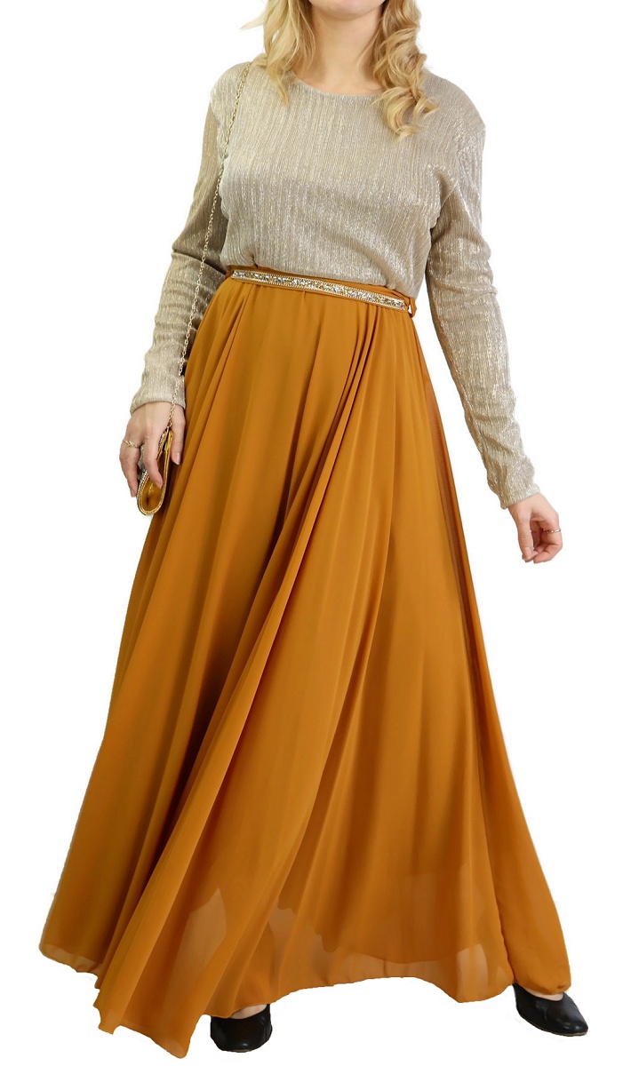 Robe de soirée maxi-longue haut brillant à manches longues - Couleur Moutarde et doré Vetement & Accessoire