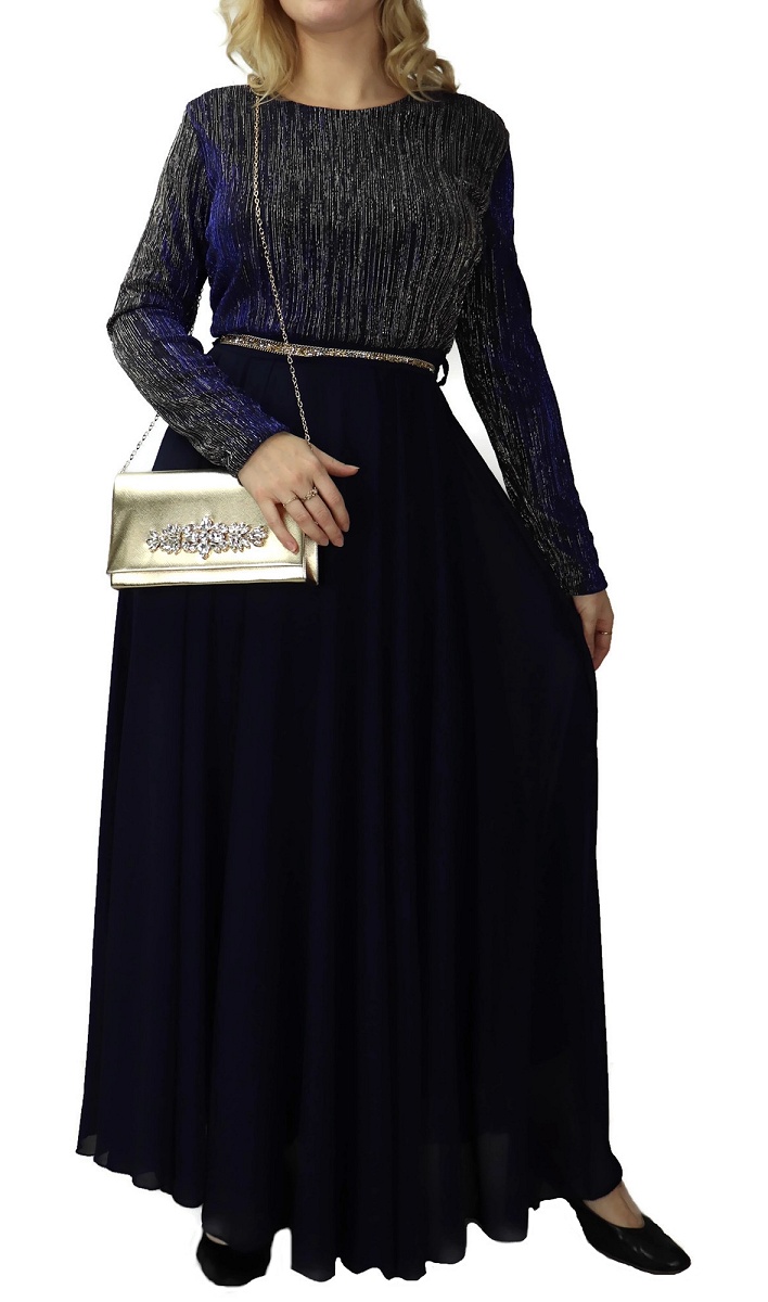 Robe de soirée maxi-longue haut brillant à manches longues - Couleur Bleu marine Vetement & Accessoire