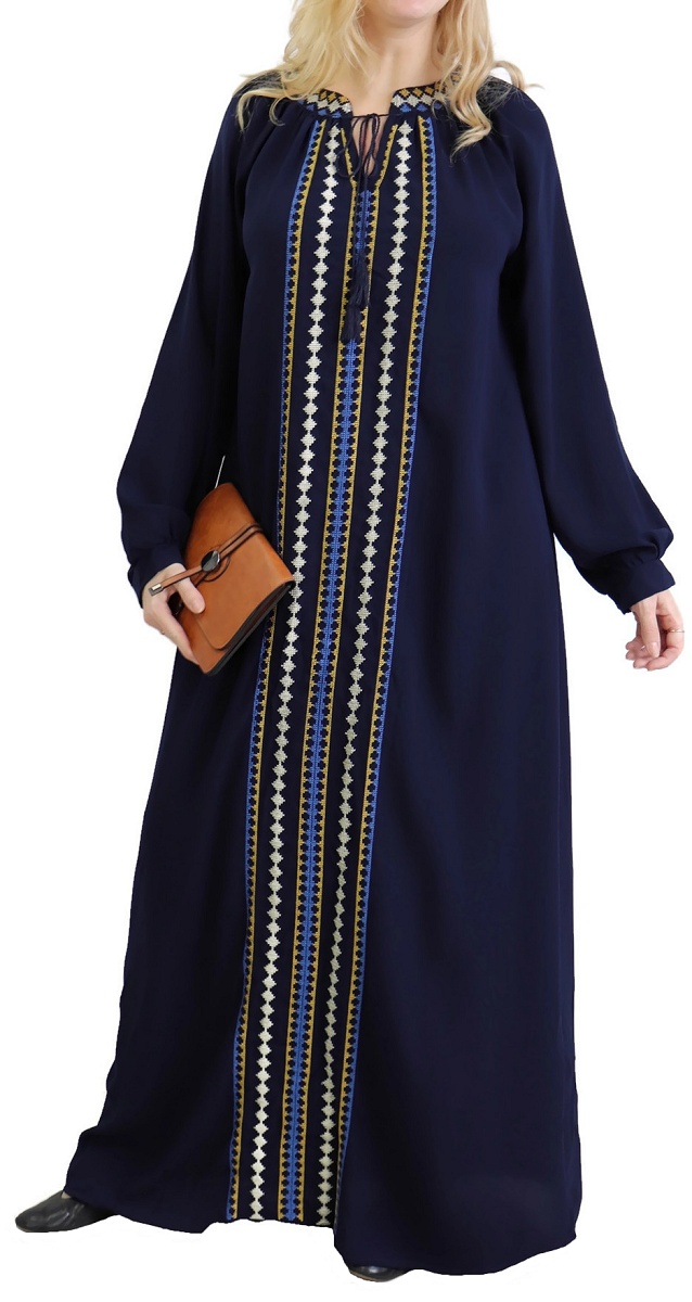 Robe longue, col Mao à nouer brodé ainsi que sur toute la longueur, manches bouffantes. Cette robe par sa broderie originale vous apportera un supplément d'élégance.