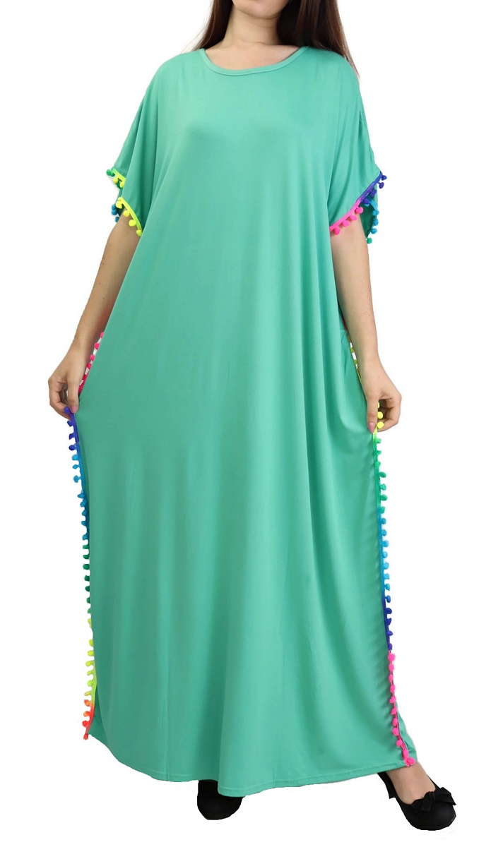 Robe orientale à pompons, fluide et légère, coupe droite, col rond, sans manches, Décorée de petits pompons de divers couleurs sur les côté pour un effet multicolore. La coupe ainsi que sa matière faciliteront une décontraction évidente.