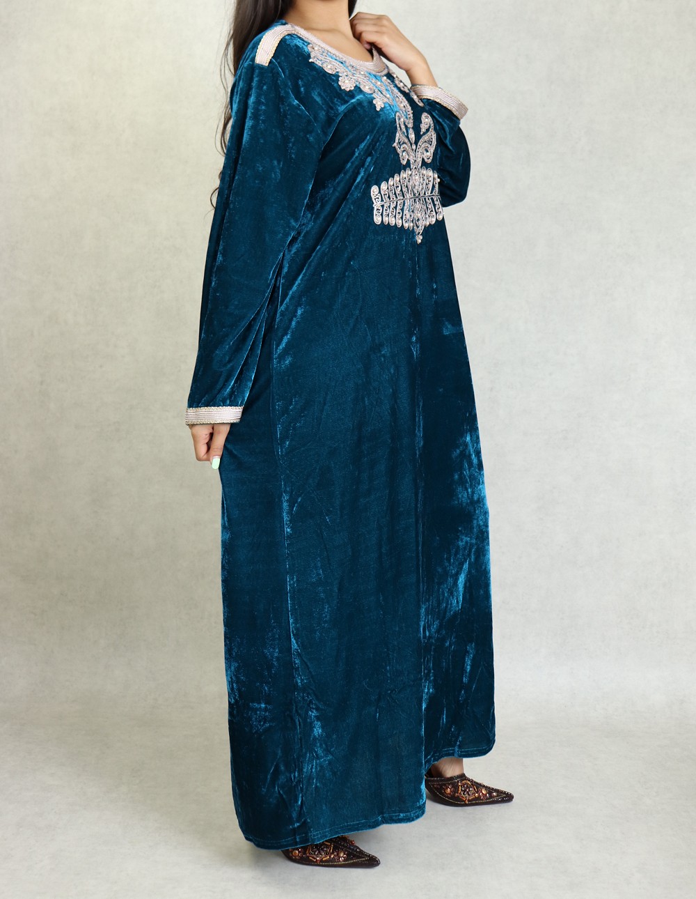 Belle robe effet velours habillée traditionnelle tunisienne. Coupe évasé, entièrement brodée avec perles et petits diamants. Le modèle possède une ceinture de l'intérieur si on désire un effet cintré, vous pouvez donc l'enfiler en toute sécurité.