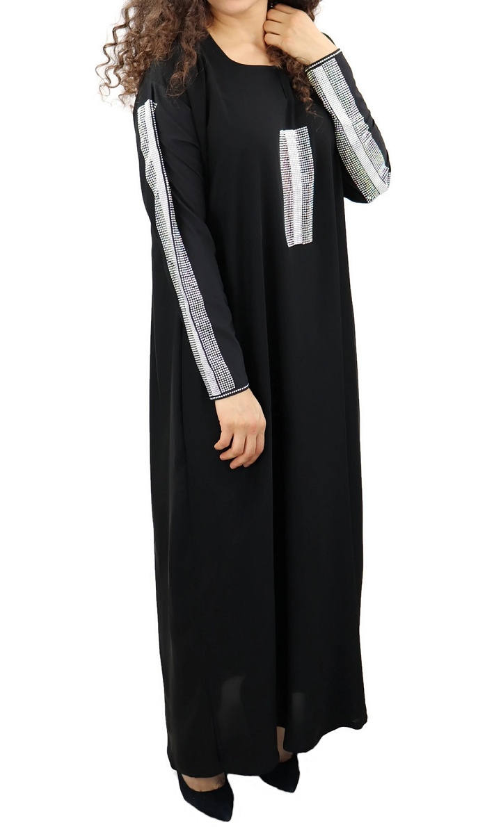 Jolie Abaya noire chic agrémentée de strass argentés sur le devant ainsi que sur toute la longueur des manches.