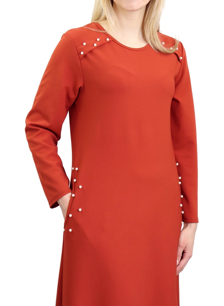 Robe longue, col rond, coupe droite, avec perle blanches sur les épaules et sur les deux poches latérales, Tissu assez épais non transparent.