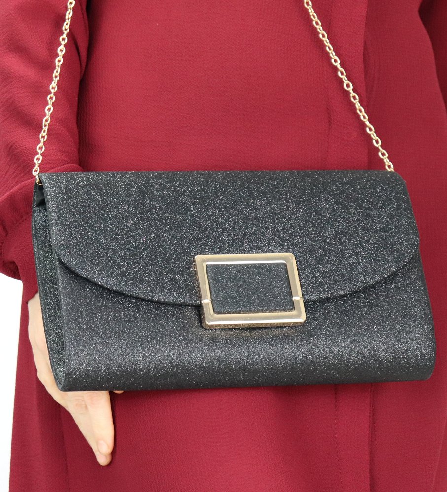 Grand sac à main pochette pour femme brillant avec micro strass. Il se porte à la main ou à l'épaule grâce à sa bandoulière en chaînette amovible. Fermeture à rabat avec bouton-pression. Partie métallique au niveau de la fermeture.