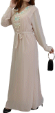 Robe longue, col chemise, fermeture boutons sur le buste, manches longues finition boutons aux poignets, taille cintrée, ceinture à passants. Coupe évasée vers le bas, tissu effet jean.