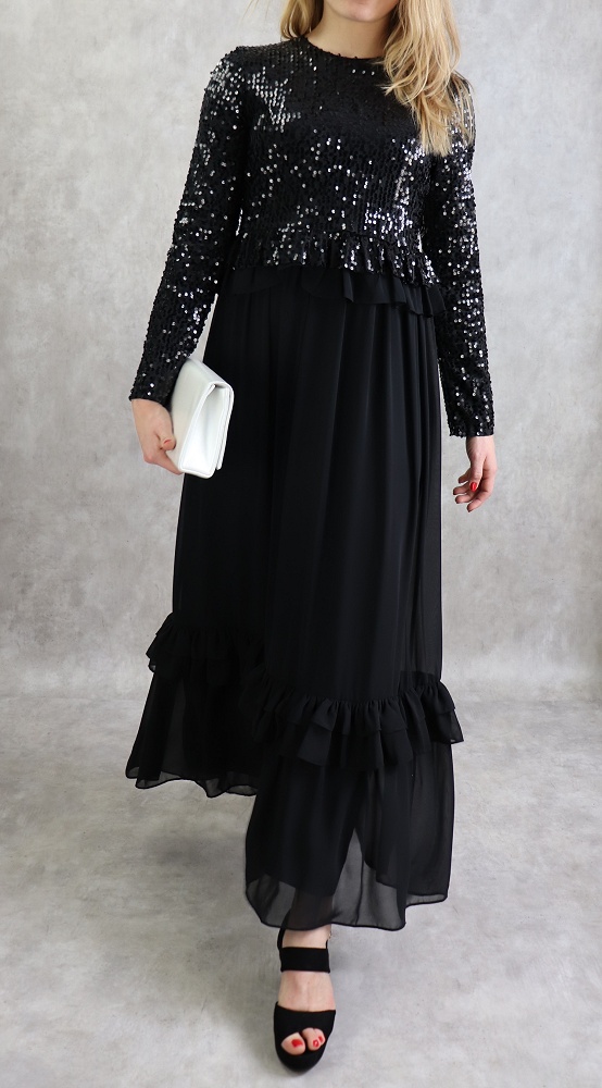 Robe longue, col rond, strass sur tout le buste et les manches, fermeture éclair au dos, taille cintrée, tulle doublée sur la moitié basse de la robe.