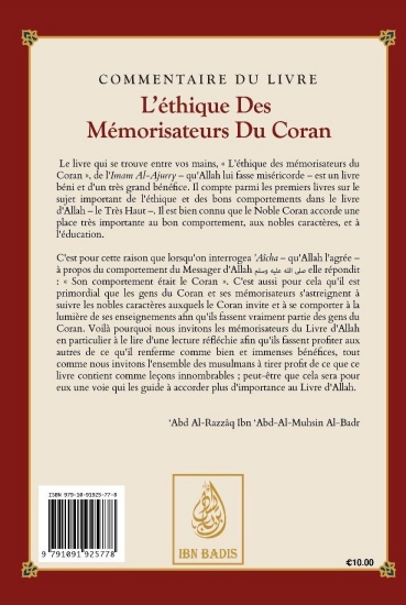 Le livre qui se trouve entre vos mains, « L’éthique des mémorisateurs du Coran », de l'Imam Al-Ajurry – qu'Allah lui fasse miséricorde – est un livre béni et d'un très grand bénéfice. Il compte parmi les premiers livres sur le sujet important de l'éthique et des bons comportements dans le livre d'Allah – le Très Haut –. Il est bien connu que le Noble Coran accorde une place très importante au bon comportement, aux nobles caractères, et à l'éducation.