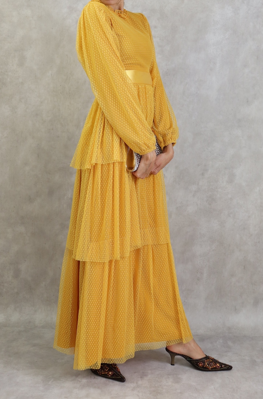 Robe longue, col rond à petite collerette, fermeture glissière au dos, manches finition élastique aux poignets, taille cintrée, ceinture satinée cousue, entièrement doublée, tissu extérieur effet tulle, volants sur la partie basse.