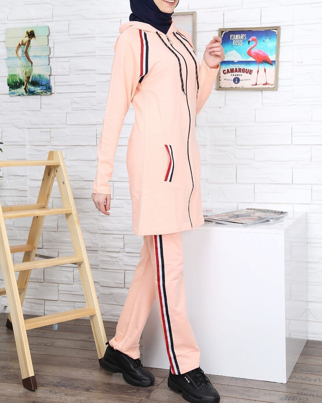 Survêtement 2 pièces. Veste : mi longue, capuche avec liens de serrage, fermeture zippée, 2 poches latérales, coupe droite, matière sweat. Pantalon : coupe droite, taille élastique.