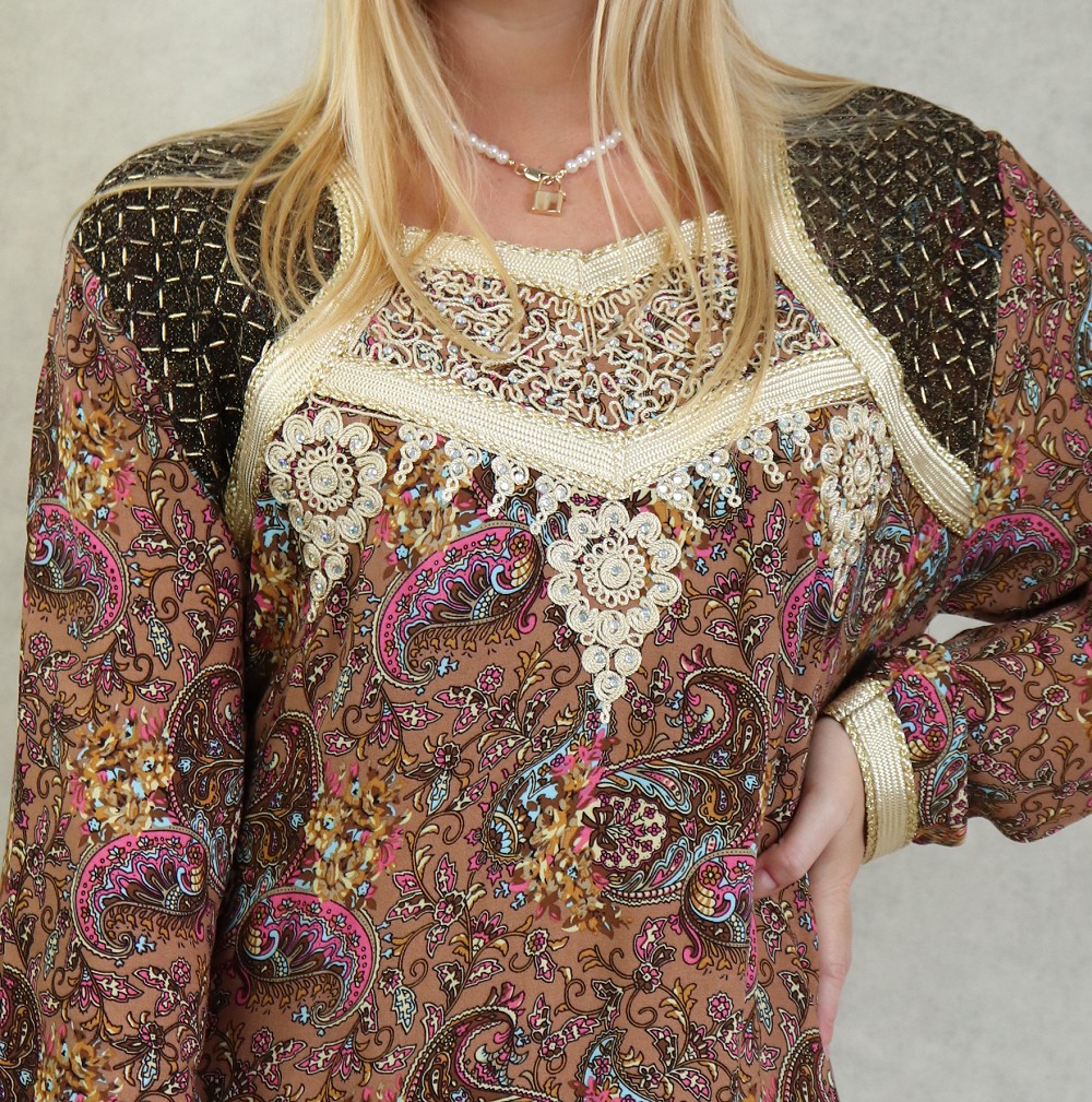 Vous voulez adopter un look original aux couleurs acidulées et résolument féminines ? Cette robe aux nombreux atouts, avec différentes broderies dorées et décorations, tissu coton fluide, à porter aussi bien l'été qu'en toute saison au sein du foyer, pour être à l'aise dans les tâches de la vie quotidienne.