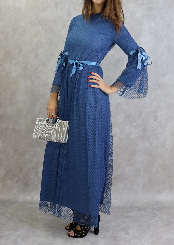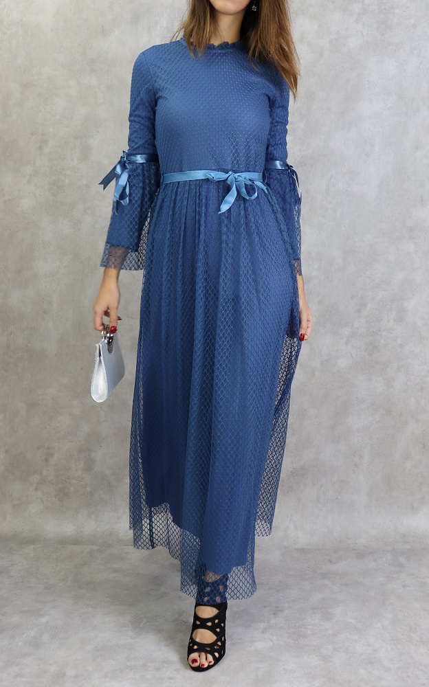 Robe longue, col rond, fermeture zippée au dos, manches longues, taille cintrée, ceinture satinée assortie. Coupe droite légèrement évasée, entièrement doublée.