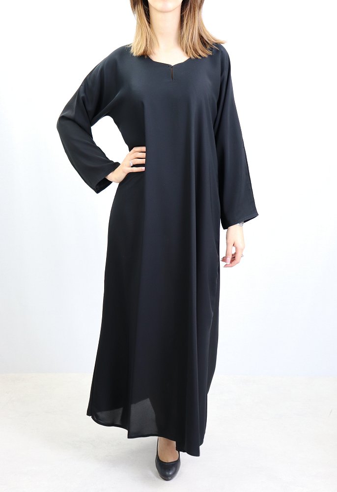 Abaya simple fabriqué aux Emirats. Fermeture par bouton pression au niveau du cou. Tissu de qualité supérieure fluide et résistant (ne bouge pas après plusieurs lavages).