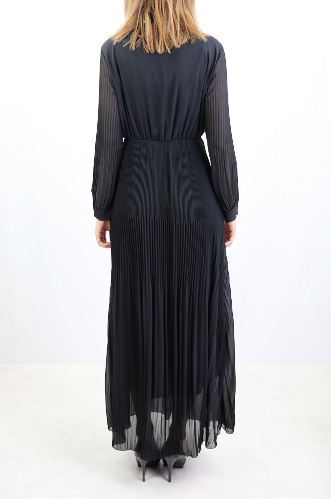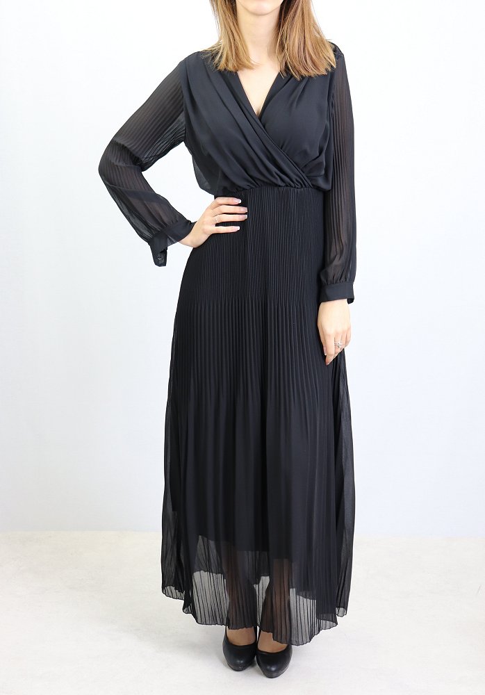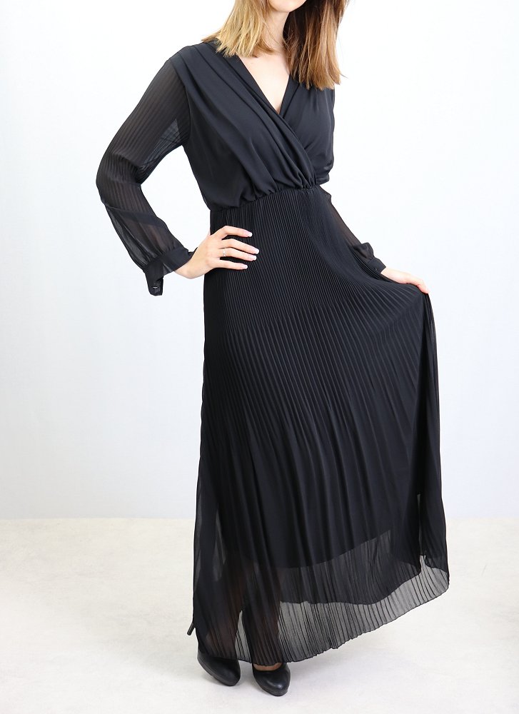 Cette longue robe plissée jaune ne laissera rien transparaître de vos formes grâce à sa doublure. En cache-cœur, elle dispose de longues manches.