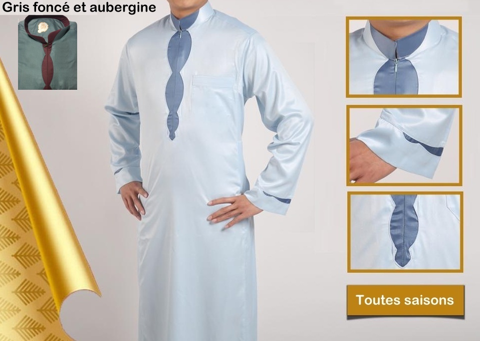 Qamis de couleur gris foncé avec partie col, poitrine et poignets en couleur aubergine.